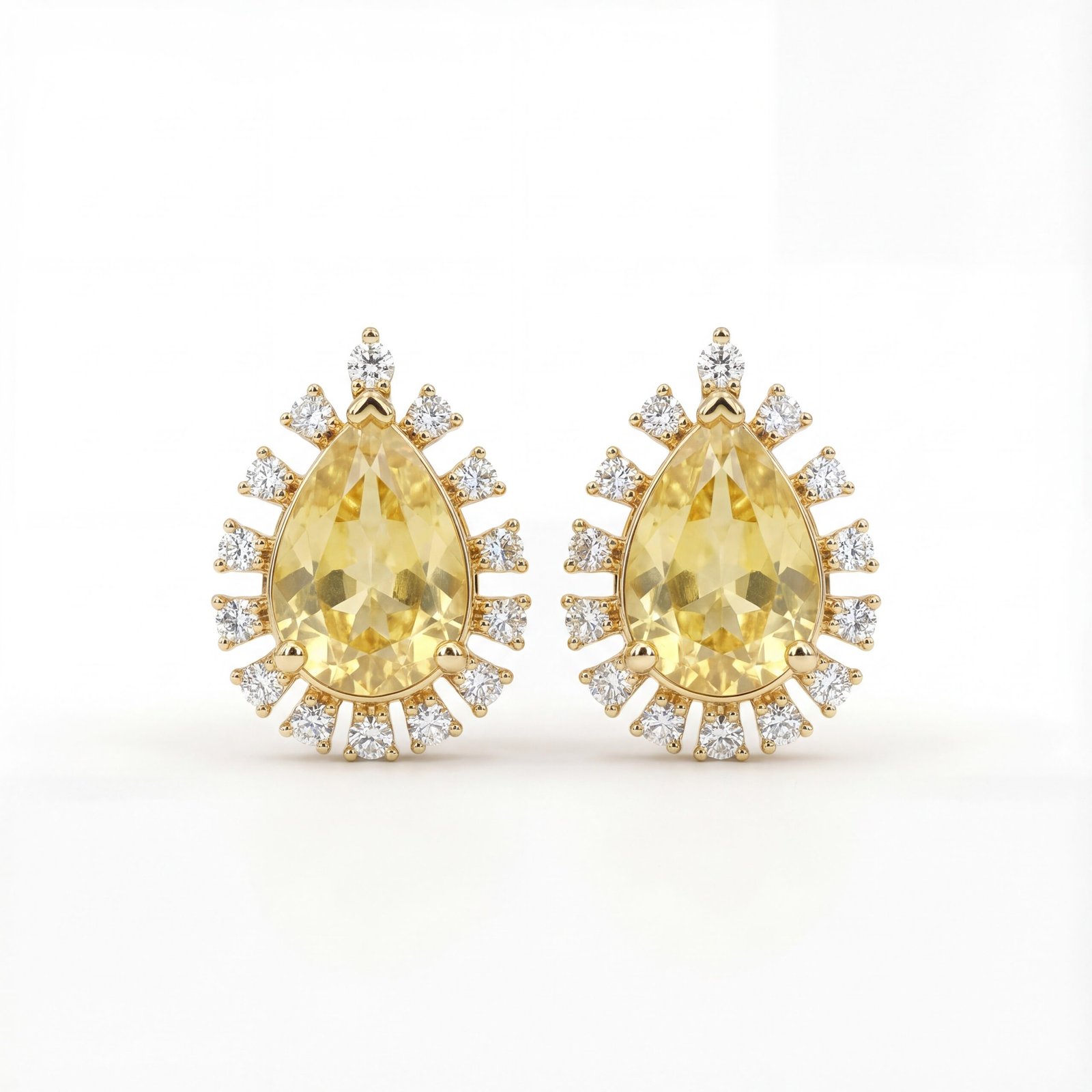 Crafted in 14K yellow gold, these elegant stud earrings feature luminous pear-shaped yellow gemstones, beautifully framed by a radiant halo of round lab-grown diamonds. A timeless design that blends classic sophistication with graceful sparkle—perfect for festive wear, gifting, and special occasions.