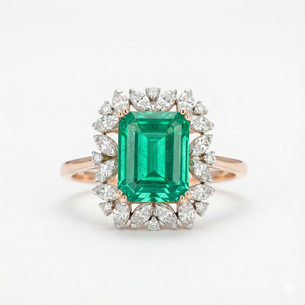 An exquisite statement ring crafted in 14K rose gold, featuring a striking emerald-cut green emerald at the centre, surrounded by a radiant floral halo of marquise-cut lab-grown diamonds. Regal, timeless, and luxurious, this design is perfect for bridal wear and grand occasions.