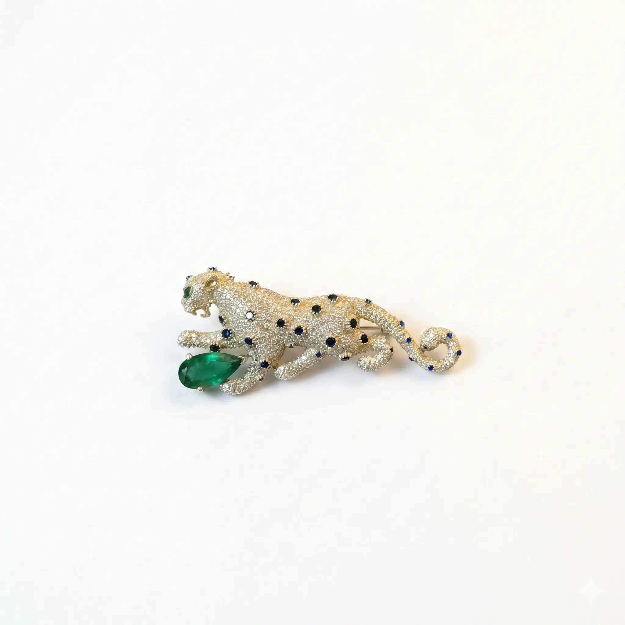 A bold and finely crafted leopard-inspired silver brooch, designed to capture strength, motion, and elegance. Made in polished silver, the brooch is embellished with carefully set color stones that form the leopard’s distinctive spotted pattern. The vivid green color stone held delicately in its grasp adds a striking focal point, while matching green eyes bring the design to life.