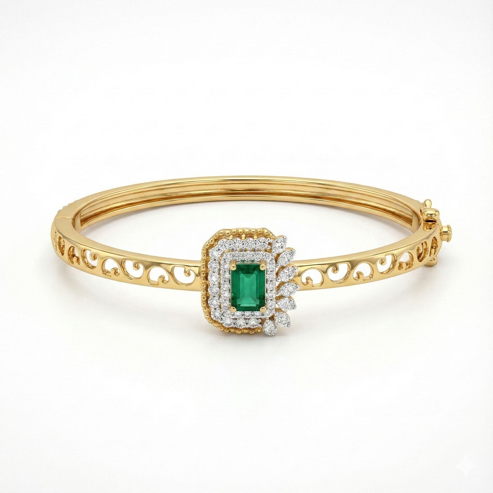 A true statement of royalty and grace, this exquisite bangle features a stunning emerald-cut green gemstone encased in a double diamond halo, beautifully complemented by elegant marquise diamond accents. Crafted in luxurious 14K yellow gold, the intricately carved openwork bangle adds sophistication, detail, and timeless beauty to the design. Radiant, refined, and irresistibly elegant, it is perfect for festive wear, weddings, and grand celebrations.