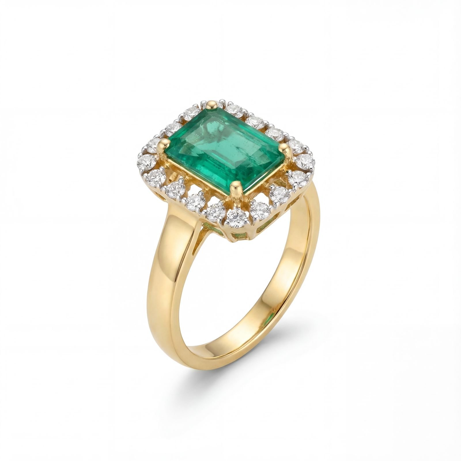 This captivating 14K yellow gold ring features a vivid emerald-cut green gemstone surrounded by a brilliant diamond halo. Radiant, powerful, and luxurious — a signature masterpiece for premium styling.