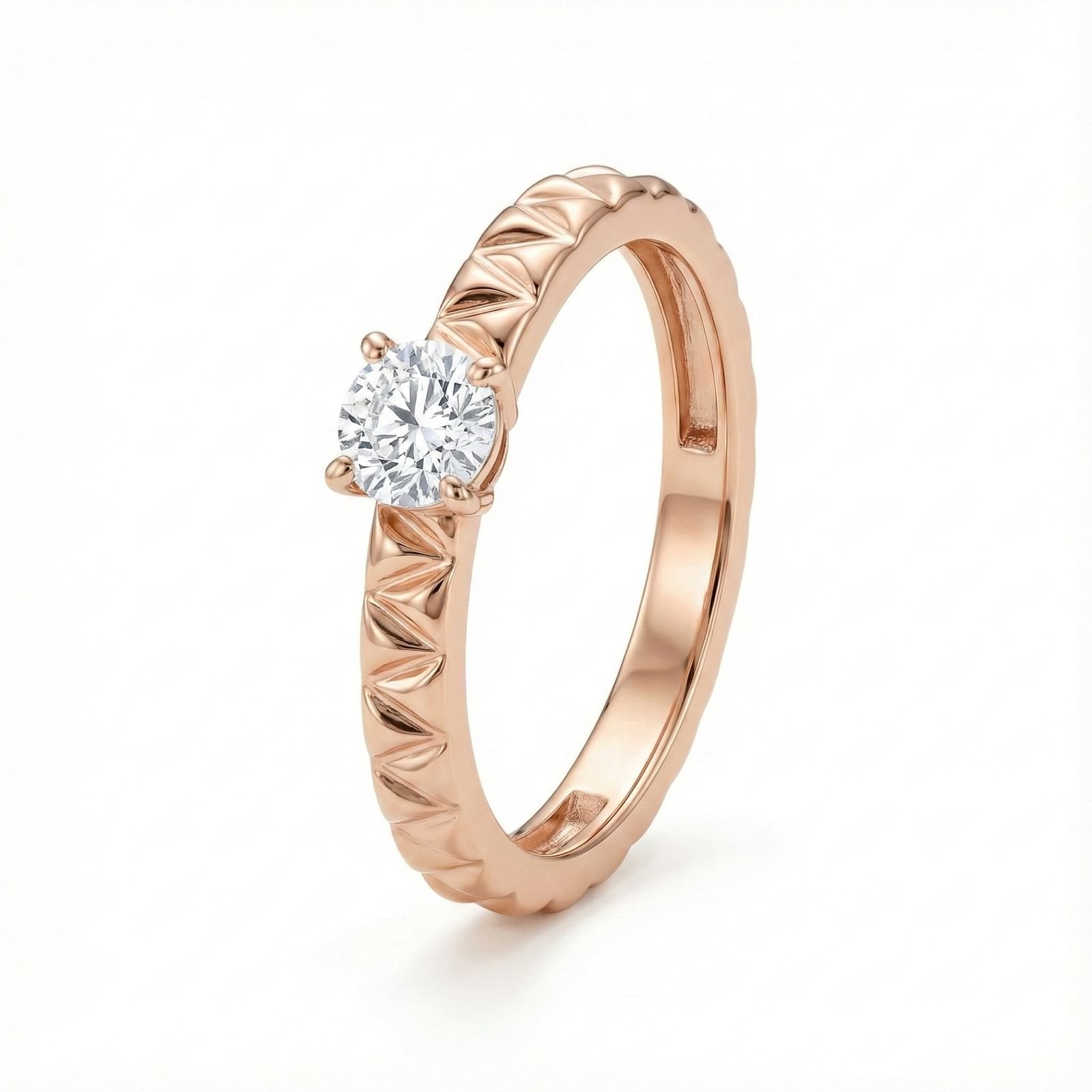 Minimal, modern, and meaningful. This 14K rose gold solitaire ring features a sparkling lab-grown diamond set atop a beautifully patterned band, offering a refined twist to classic elegance. Ideal for proposals, anniversaries, or personal luxury.
