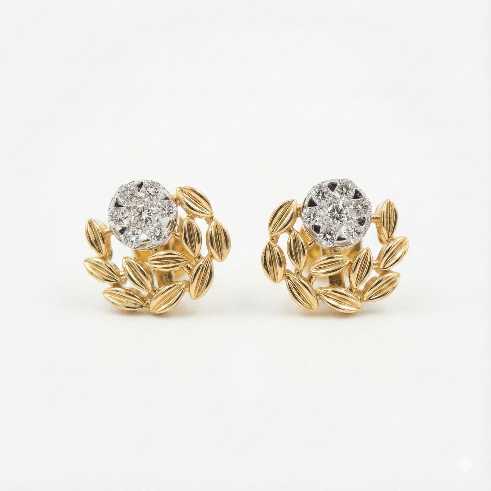 Bring home timeless charm with these beautifully crafted diamond studs, designed with an artistic wreath of polished gold petals embracing a radiant diamond cluster at the center. The harmonious blend of shimmering diamonds and warm gold tones creates a refined and graceful look, perfect for elevating everyday elegance as well as special occasion style.