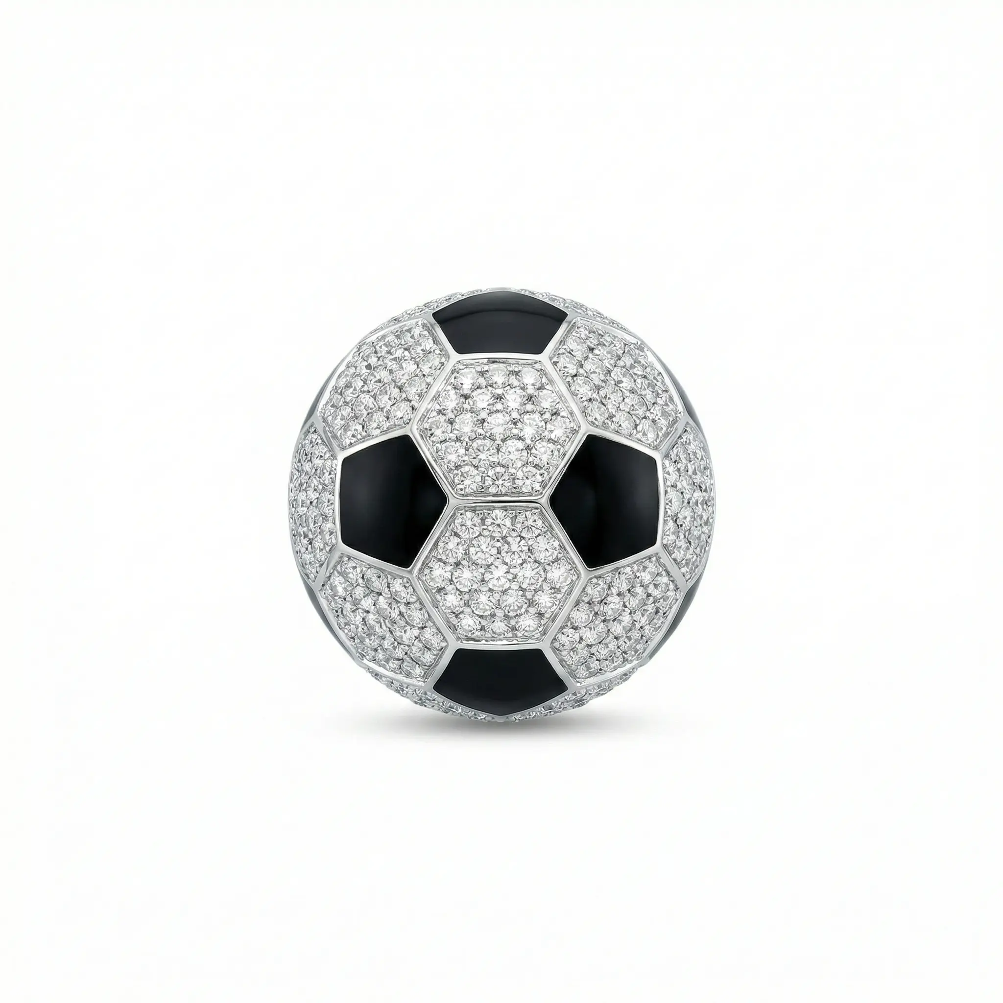 A sleek and contemporary football-inspired silver brooch, crafted with precision and modern appeal. Designed in polished silver, the brooch features carefully set clear color stones that create a brilliant surface, complemented by bold black enamel panels that define the iconic football pattern.