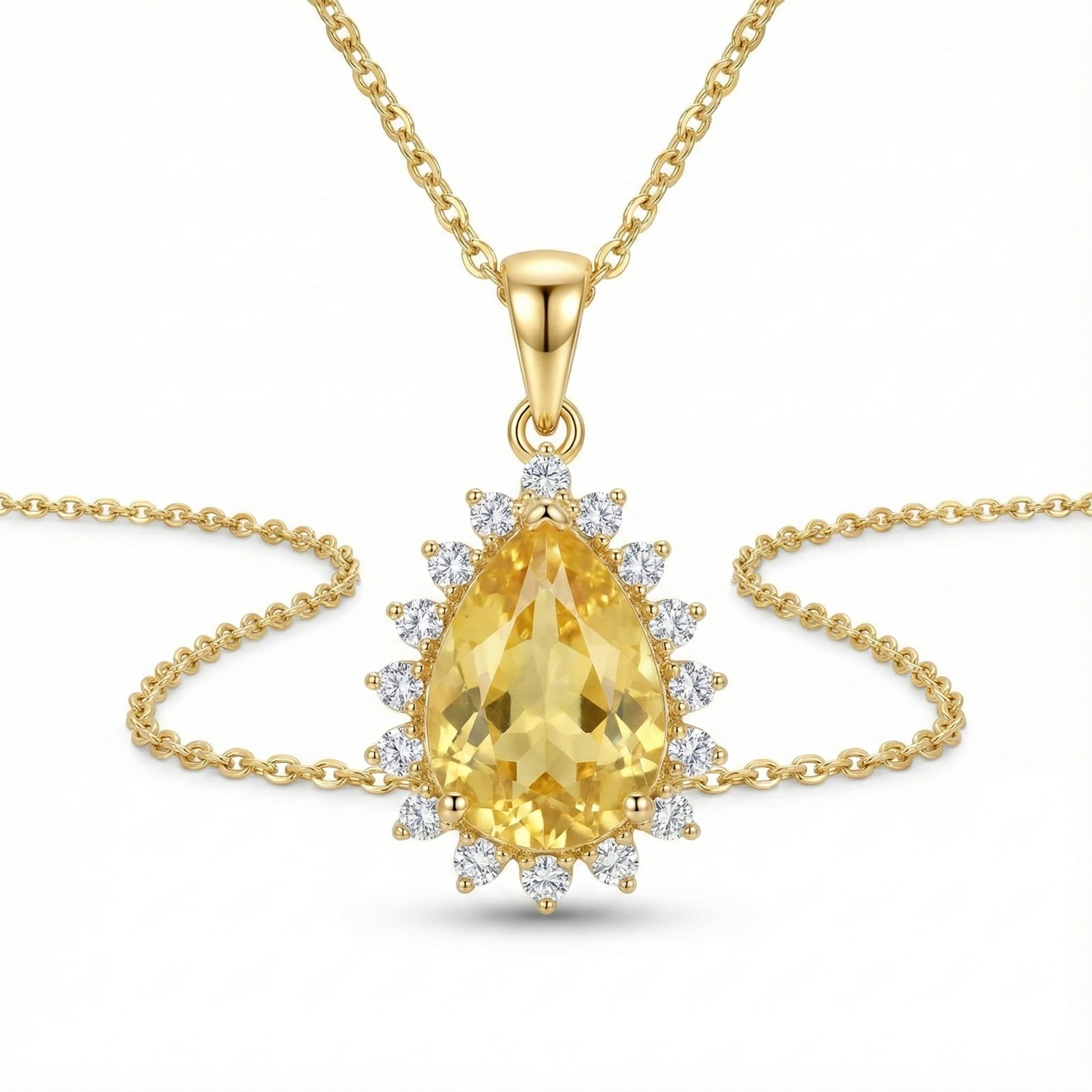 Radiant and captivating, this pendant features a stunning pear-shaped yellow gemstone beautifully framed by a brilliant halo of sparkling diamonds. Set in luxurious 14K yellow gold, the vibrant gemstone glows like captured sunshine, making it an eye-catching centerpiece. Elegant, timeless, and exquisitely crafted, it adds instant sophistication to festive looks, evening wear, and special celebrations.