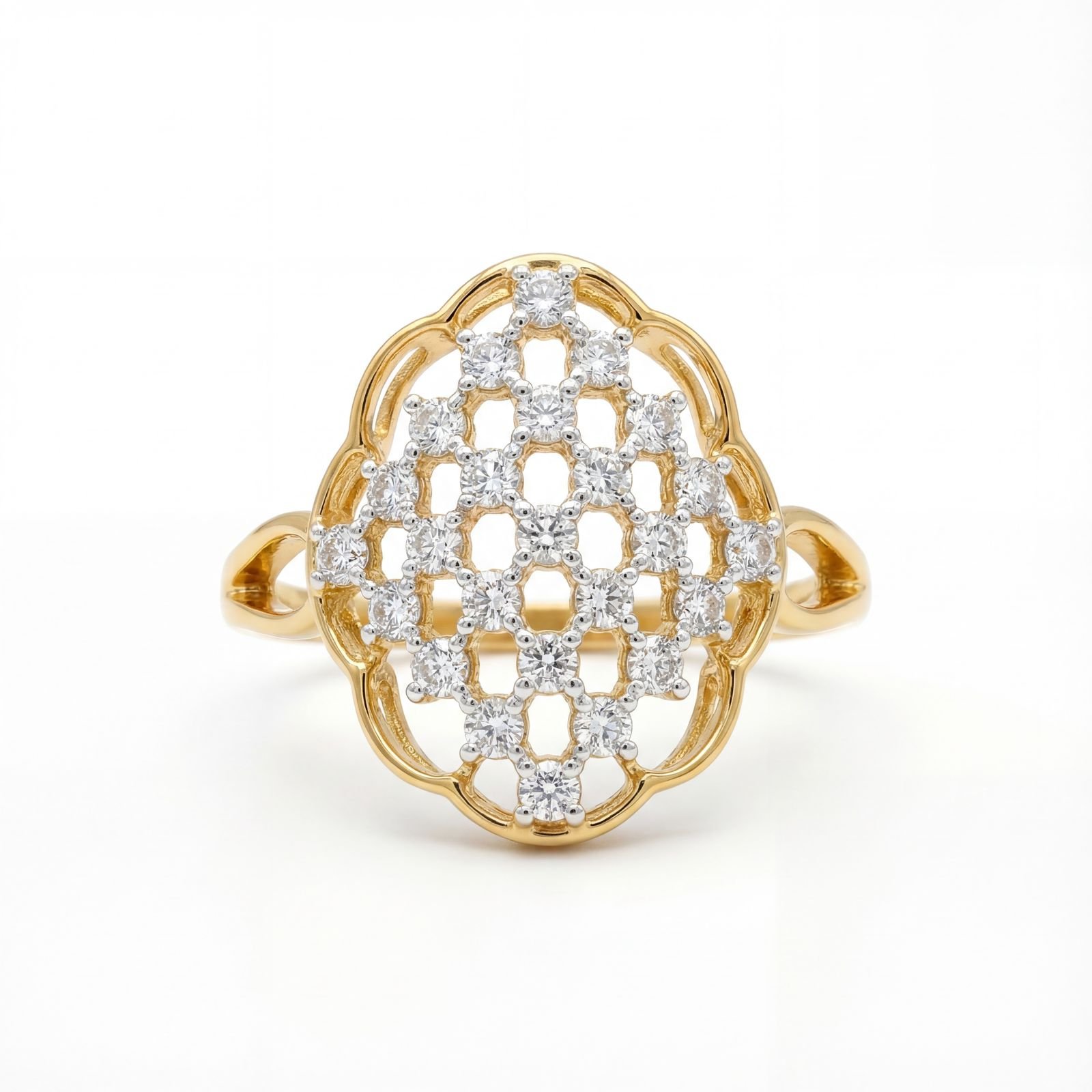 Crafted in 14K yellow gold, this intricately designed ring showcases a stunning lattice-style diamond pattern set within a scalloped frame. Its rich detailing and premium craftsmanship create a sophisticated vintage appeal.