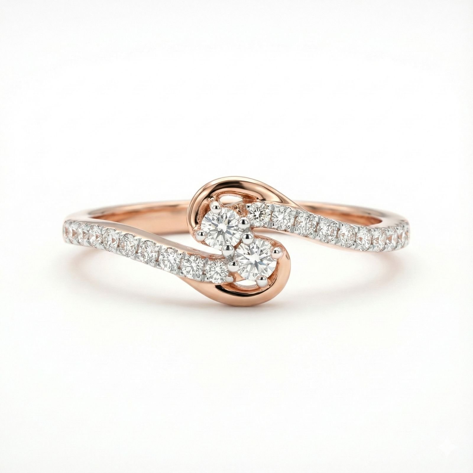 Featuring twin brilliant diamonds symbolizing love and togetherness, this elegant ring is crafted in 14K rose gold with a gracefully twisting diamond-lined band. Romantic, refined, and meaningful — a perfect promise or anniversary ring.