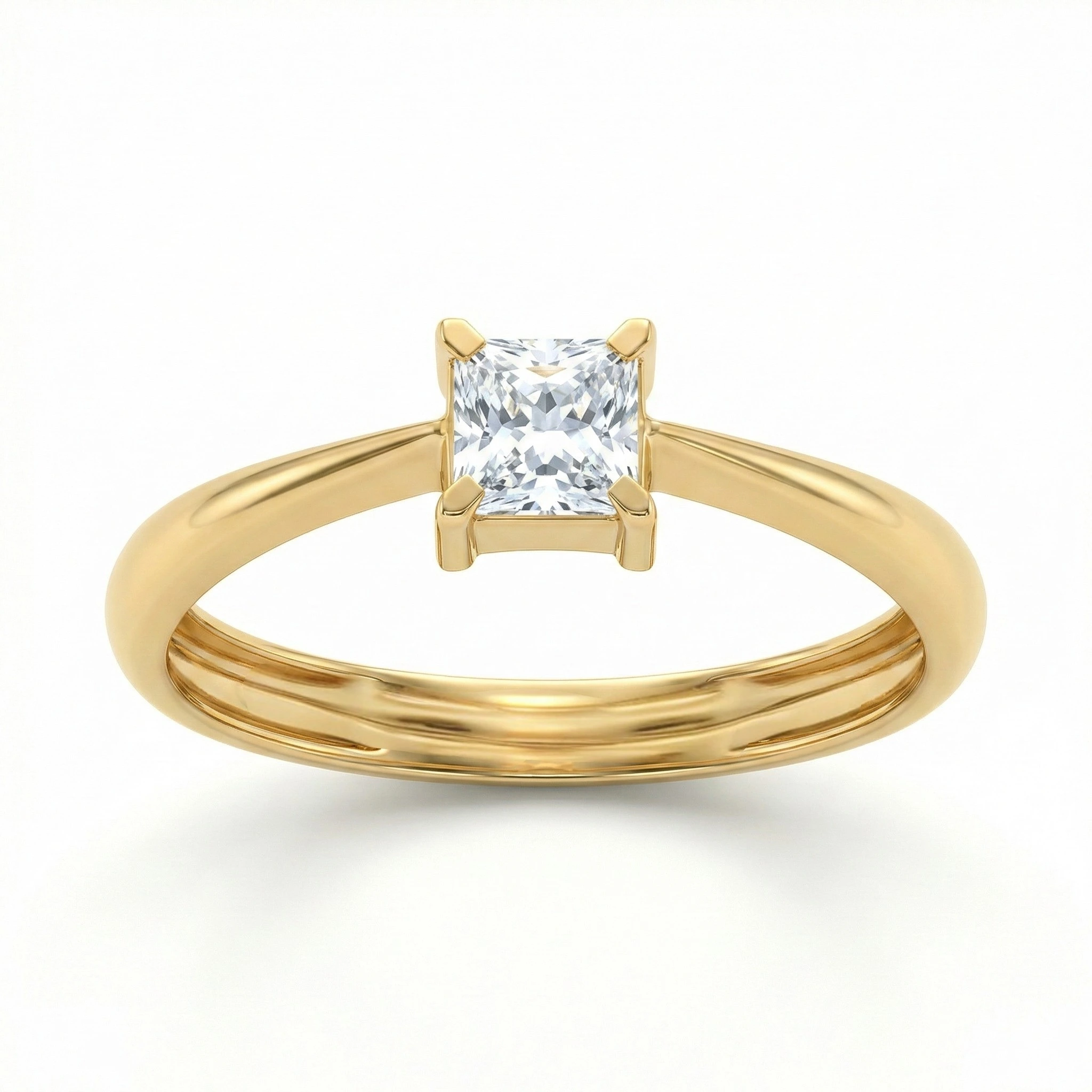 The Eternal Square Single Stone Ring celebrates modern elegance through its striking square (princess-cut) centerpiece stone. Set in a refined four-prong setting, the clean geometry of the stone offers sharp brilliance and a contemporary edge. The smooth, polished gold band enhances the stone