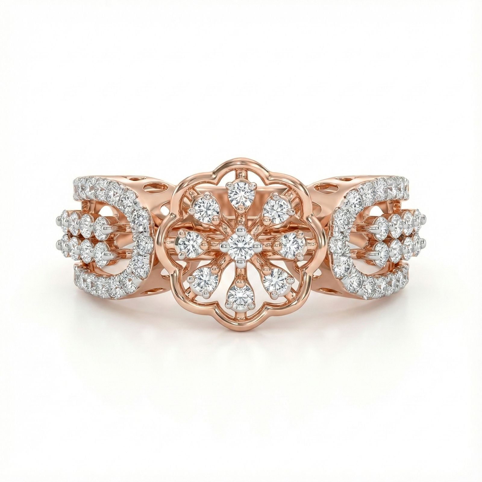This luxurious floral masterpiece showcases intricate diamond artistry set in 14K rose gold. The ornate center bloom is complemented by diamond-embellished side motifs, giving it a royal jewellery aesthetic ideal for weddings and celebrations.