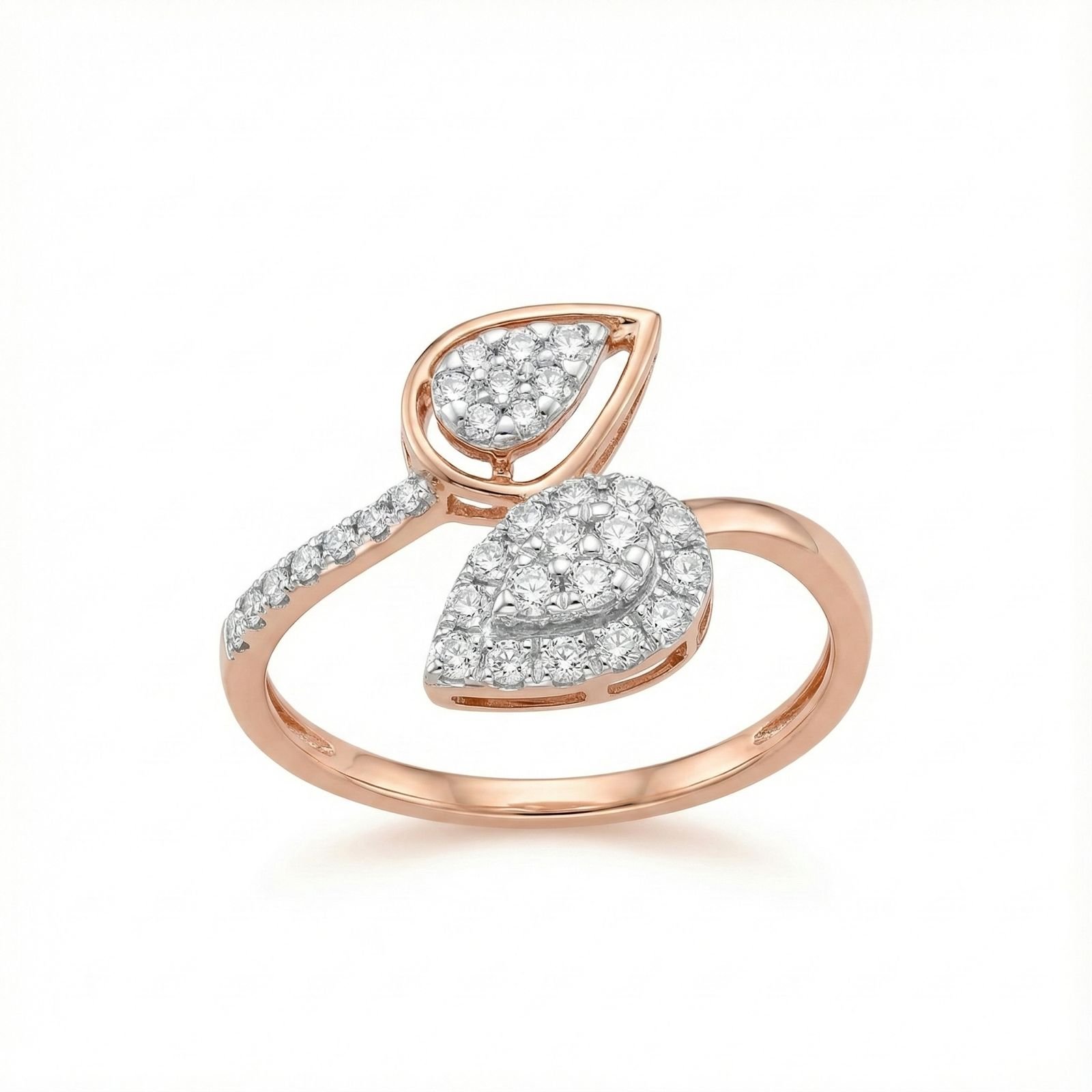 Inspired by nature’s elegance, this artistic bypass ring features two pear-shaped lab-grown diamond clusters designed like graceful leaves. Set in 14K rose gold with a diamond-studded band, it delivers feminine sophistication with contemporary flair.